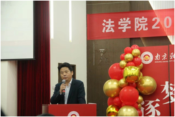 优秀校友代表,北京观韬中茂(南京)律师事务所管理合伙人、南京市律师协会副秘书长王政律师也在典礼上发言。他表达了对母校的感激之情和对未来的美好憧憬,回顾了在校期间的点点滴滴,分享了自己的成长经历和感悟。同时,他以“内卷”和“躺平”两个关键词给同学们上了一堂职业生涯规划课。他说真正的内卷并不可怕,作为时代新人,同学们应当做到的是正视内卷,拒绝躺平。要充分发挥能动性,积极拓展外部资源,避免低水平重复的内卷。同时,要勇于创新,积极发掘内部潜力,习惯在环境的约束下挖掘潜能。