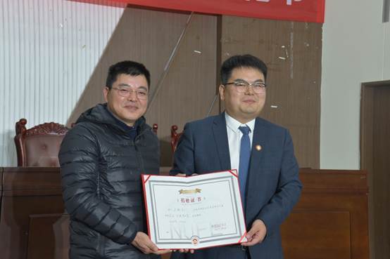 陆明峰处长给王佩校友颁发捐赠证书