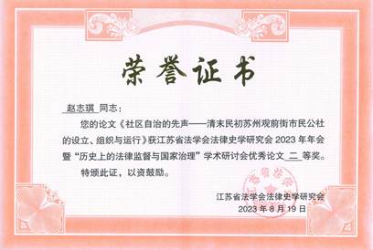 夏清瑕教授主持了本次会议的第三单元“革命根据地法律监督与国家治理”。徐进博士受邀担任第二单元“清末民国法律监督与国家治理”评议人。赵志琪同学在该单元汇报了她的原创论文《社区自治的先声——清末民初苏州观前街市民公社的设立、组织与运行》。会议结束后,主办方对论文进行了评奖。徐进博士的论文荣获一等奖,赵志琪同学的论文荣获二等奖。Blackjack中文版在线玩 师生同与会专家学者开展了热烈的交流。