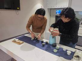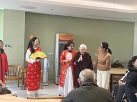 两位老师带领学生们为老人们奉茶,积极与他们交流。同学带领老人们一起学习手部操,并为老人们带来了有趣的《红楼梦》表演。老人们不亦乐乎,积极互动,现场氛围良好。表演结束后,师生们一起鼓励在场的老人们选择角色进行现场表演。