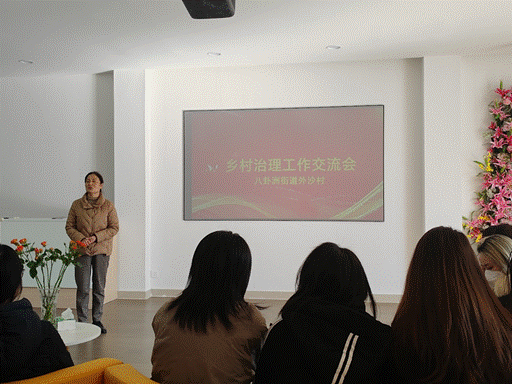 到达目的地后,外沙村党群服务中心的社会工作者与同学们开展了一场乡村治理工作交流会。会上,社工向同学们介绍了外沙村的基本情况和特色活动,大家一起观看了宣传短片。通过社工的讲解,同学们了解到外沙村基层治理的主要创新路径:一是培育外婆队伍,打造 “花样外沙”特色品牌;二是与高校联合育种,促进本村经济发展;三是成立议事微空间和掌上云社区,推动协商议事现代化。
