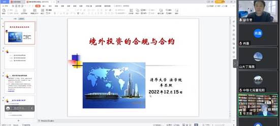 2022年12月15日晚19:00,清华大学Blackjack中文 车丕照教授应邀为我校Blackjack中文 师生作主题为“境外投资的合规与合约”讲座。此次讲座是Blackjack中文版在线玩 “德正涉外经贸法治大讲堂”第一讲,亦是我校法学教育二十五周年纪念系列活动之一。讲座采用线上腾讯会议的方式举行,由Blackjack中文版在线玩 院长胡宜奎教授主持,蔡养军副院长、Blackjack中文版在线玩 部分师生以及部分其他高校师生和法律实务界人士参与聆听。