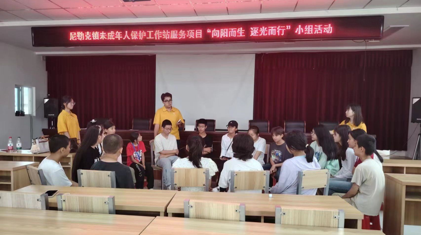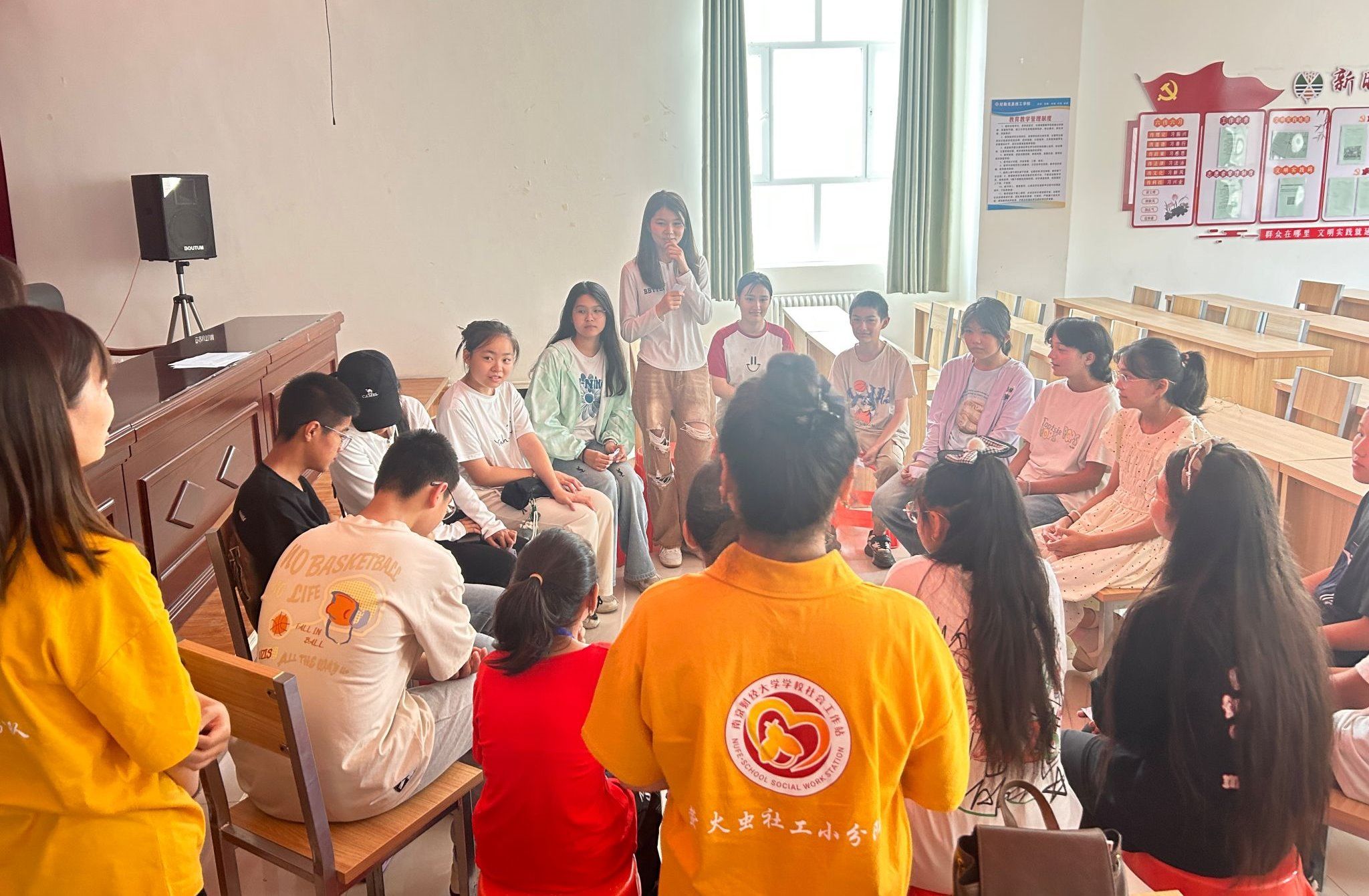 针对12-14岁的初中阶段的青少年,我们设计了以“向阳而生,逐光而行”的成长小组,也分别设计了“独一无二的我”“健康向上的我”“闪闪发光的我”“心想事成的我”“乘风破浪的我”五个单元的小组工作。社工同学们运用同理心、尊重等专业技巧,以趣味文体游戏、户外团队协作活动、民族文化展示、个人分享、剧本演绎等多样形式,引导这些青春期少年们逐渐敞开心扉,从陌生到亲密,从内敛到侃侃而谈,变得越来越自信。“萤火虫”社工学生们正是通过专业服务,秉持“寓教于乐,寓教于趣”的理念,引导这些青少年们努力让自己“靠近光、成为光、散发光”,给这些青少年带来正向的成长观念。