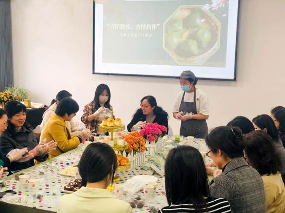 此次活动邀请了专业糕点师傅向大家介绍,并手把手教学青团的制作。女教职工们认真观看师傅的现场教学,记下关键手法和制作要领。在随后的实操环节中,大家分工合作、各显神通,搓团、压扁、加馅、包圆……虽然每一个步骤都是细活,但这一点难不倒我们心灵手巧的女同胞们。半小时后,一个个圆鼓鼓的青团新鲜出炉,大家一边吃一边畅谈美好的心情和感悟,分享生活中的点滴趣事,既有对家庭生活的感悟,也有对学校发展建设的美好期待,更有表示为学校建设发展贡献力量的决心。