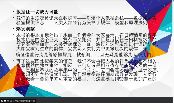 以《爆发:大数据时代预见未来的新思维》这本书的部分阅读分享为例,张洋同学给大家介绍了人类看待自身和世界的一些传统思维方式,并就数据如何使得认识并预测人类的生活方式得以可能进行了简单引入。吴彤同学针对汇报内容进行了进一步的补充,并就相关概念,如“扩散理论”进行了重点解释。王娅老师则针对两位同学的汇报和评议过程指出其中的不足或者值得肯定的地方,并就相关延伸思考或推荐阅读书籍,如《咖啡机中的间谍:个人隐私的终结》等进行了简要介绍。