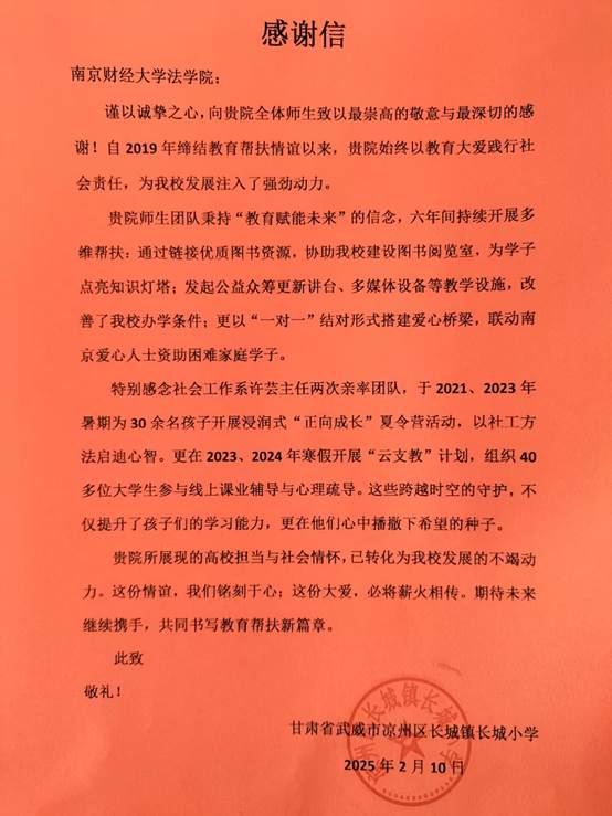 六年多来,Blackjack中文 通过整合多方社会资源,不仅为长城小学提供了物质支持,改善了教学设施,提升了学校的精神面貌,还通过短期暑期正向成长系列活动和长期结对帮扶,为留守儿童提供了全方位的支持。2020年,中国社会工作教育协会曾授予Blackjack中文 团队“嘉奖令”,表彰其在脱贫攻坚中的突出贡献。2025年初,武威市长城小学为Blackjack中文版在线玩 寄来了感谢信,表达了长期以来对长城小学支持的感谢之情。