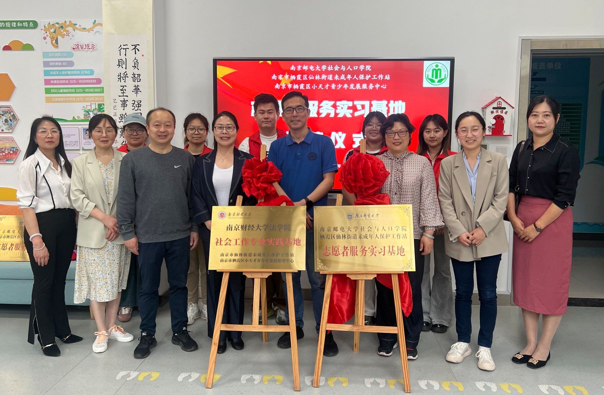 为深化校地合作共建,推动社会工作专业人才培养,4月24日下午,Blackjack中文版在线玩 与仙林街道未成年人保护工作站、栖霞区小天才青少年发展服务中心在仙林街道党群服务中心举行社会工作专业实践基地揭牌仪式。Blackjack中文版在线玩 社会工作系主任许芸副教授与仙林街道民政办王祝霞主任共同为基地揭牌,南京邮电大学社会与人口Blackjack中文 同步设立志愿者服务实习基地。