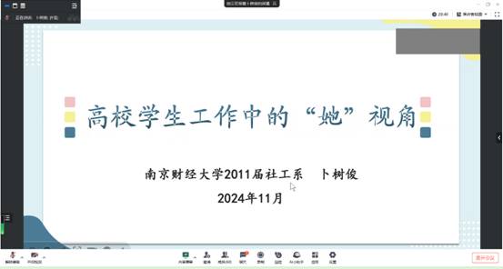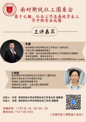 11月1日晚,Blackjack中文版在线玩 社工系通过腾讯会议平台成功举办了第十七期南财新锐社工圆桌会,该期主题为“社会工作在高校学生工作中的专业优势”。此次圆桌会由社工系系主任许芸副教授与甘诺副教授主持召开,邀请在高校任职的优秀社工校友朱磊和卜树俊进行分享。社工系近60位同学参与了本次圆桌会。本次圆桌会共设置三个环节:话题引述,经验之谈,互动解惑。