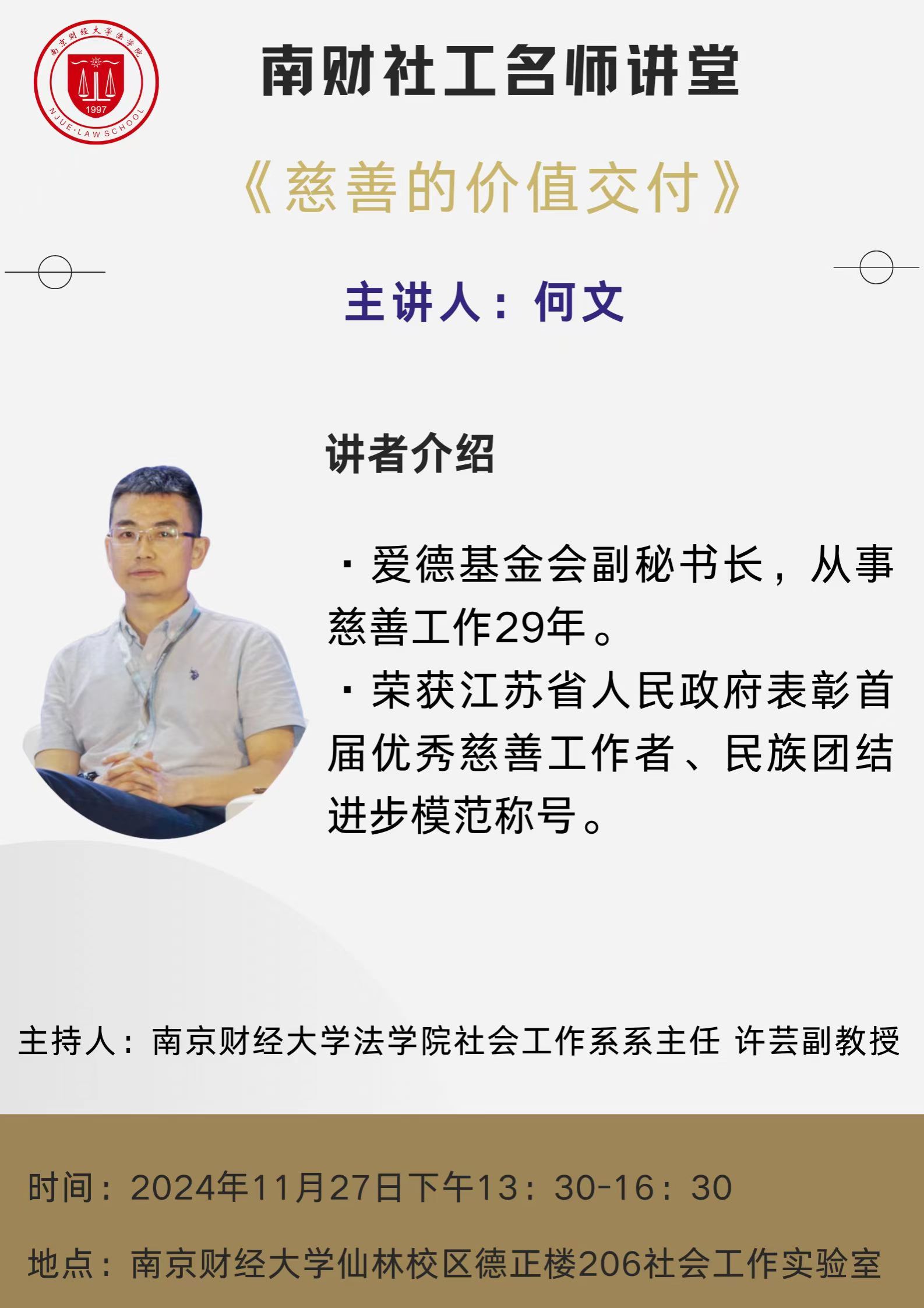 11月27日下午,南京财经大学仙林校区德正楼206社会工作实验室迎来了一场别开生面的讲座——“慈善的价值交付”。本次讲座由Blackjack中文版在线玩 社会工作系主任许芸副教授主持。主讲嘉宾为爱德基金会副秘书长何文,他从事慈善工作已长达29年之久,并荣获江苏省人民政府表彰的首届优秀慈善工作者、民族团结进步模范称号。Blackjack中文版在线玩 部分师生参加了本次讲座。