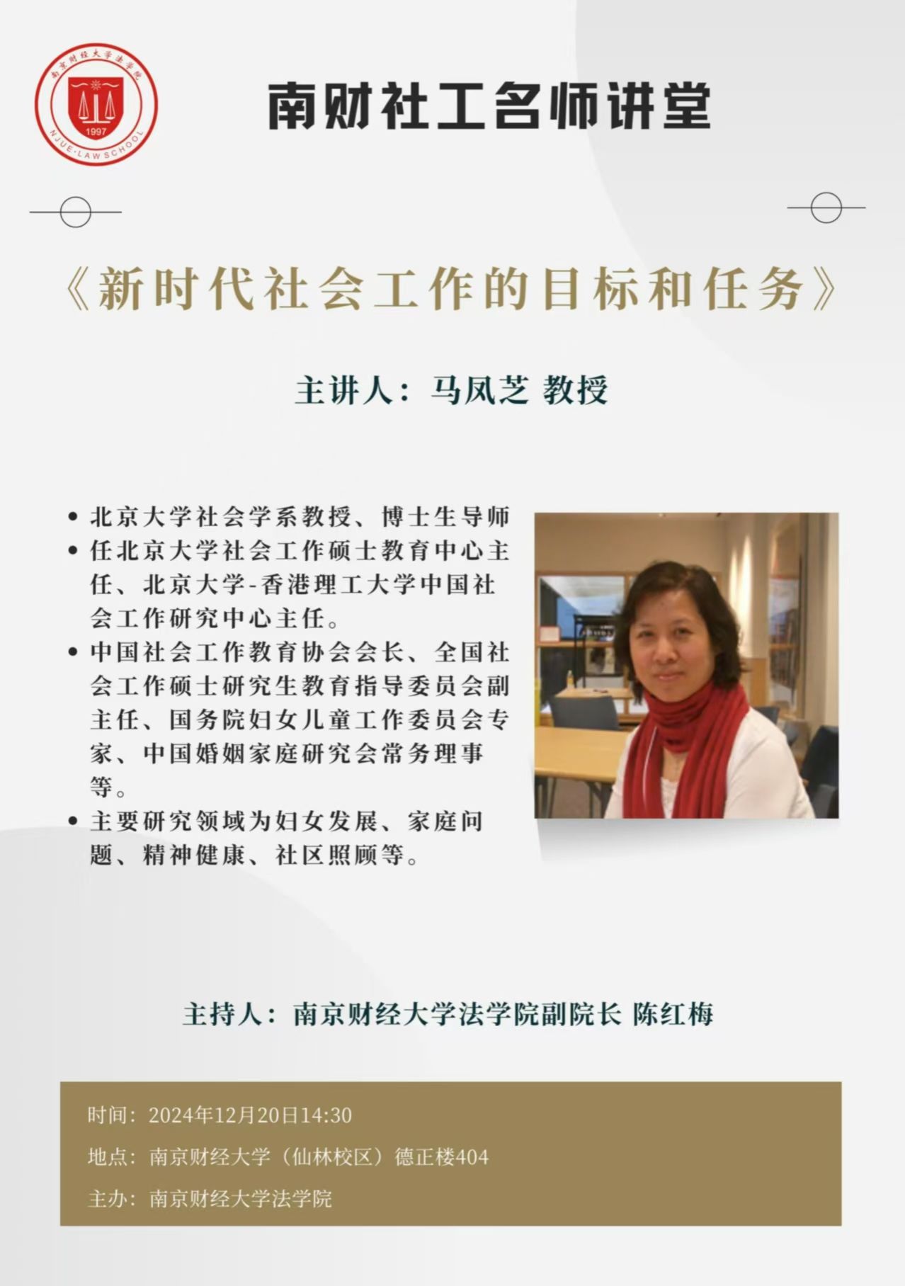 12月20日下午,Blackjack中文版在线玩 邀请中国社会工作教育协会会长、北京大学社会学系教授马凤芝在仙林校区德正楼404会议室作了题为“新时代社会工作的目标和任务”的学术讲座。Blackjack中文 社会工作系师生、社工优秀校友代表以及校外行业导师代表参与学习。讲座由Blackjack中文版在线玩 副院长陈红梅教授主持。