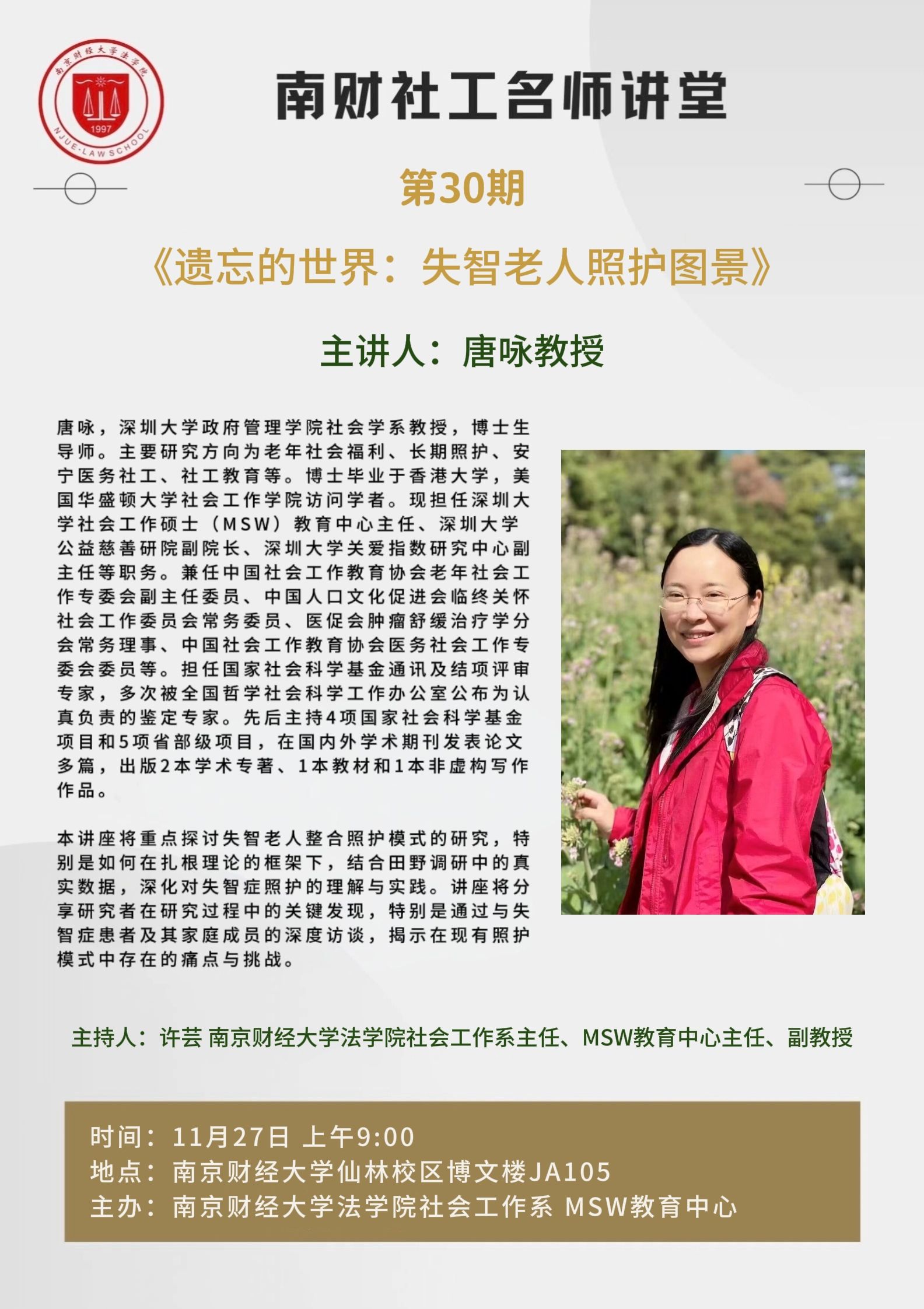 11月27日上午,深圳大学政府管理Blackjack中文 社会学系博士生导师、社会工作专业硕士教育中心主任唐咏教授应邀为Blackjack中文版在线玩 师生带来主题为“遗忘的世界:失智老人照护图景”的学术讲座。本次讲座由Blackjack中文版在线玩 社会工作系主任、MSW教育中心主任许芸副教授主持,社工系甘诺副教授、仲鑫副教授、高丽茹副教授、社工系林景副主任、张亮亮博士、王颖捷博士等老师,全体硕士研究生和部分本科生参加了此次讲座。
