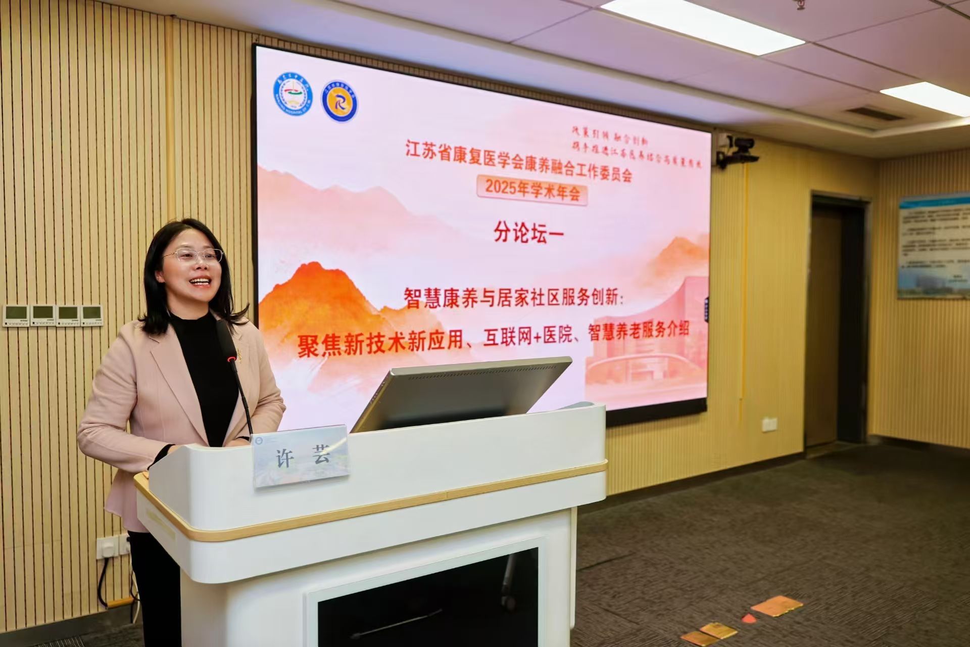 在分论坛“智慧康养与居家社区服务创新”中,许芸主任与江苏省人民医院康复医学中心蔡可书主任康复师共同主持,来自高校、企业的嘉宾聚焦新技术应用、互联网+医院、智慧养老服务等热点议题展开深入研讨。南京市建邺区民政局养老服务科葛闿乾科长分享了在深度老龄化背景下,数字消费券路径下养老服务如何重构服务生态;河海大学郭剑平副教授分享了徐州居家医疗创新模式,通过“小程序接单+专业团队上门”的市场化运作,实现了基础护理、专科护理、临终关怀等服务的高效落地;北京圆心科技集团赵静凯总经理介绍了数字健康平台构建经验,通过AI赋能打破机构壁垒,推动跨院协作与慢病管理个性化服务;南京铠维健康科技有限公司管婧副总经理详解了养老陪诊服务规范流程,其公司打造的标准化服务体系与公益服务模式获得与会者广泛认可。