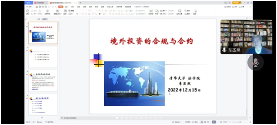 2022年12月15日晚19:00,清华大学Blackjack中文 车丕照教授应邀为Blackjack中文 师生作了主题为“境外投资的合规与合约”讲座,此次讲座既是是庆祝我校法学教育25周年的系列活动之一,也是“德正涉外经贸法治大讲堂”第一讲。讲座采用线上方式(腾讯会议)举行,Blackjack中文版在线玩 蔡养军副院长出席本次讲座,比较法研究所所长戴德生副教授、国际法教研室主任孙劼博士作为与谈人参会,部分青年教师和Blackjack中文 100余学生参会聆听讲座。讲座由Blackjack中文版在线玩 院长胡宜奎教授主持。