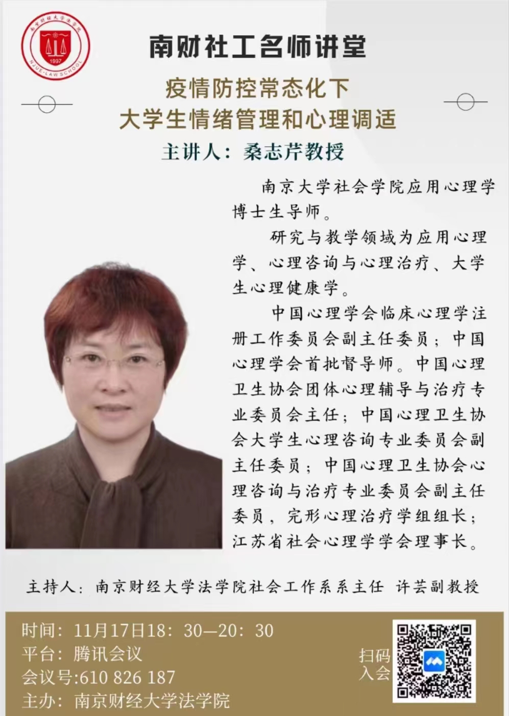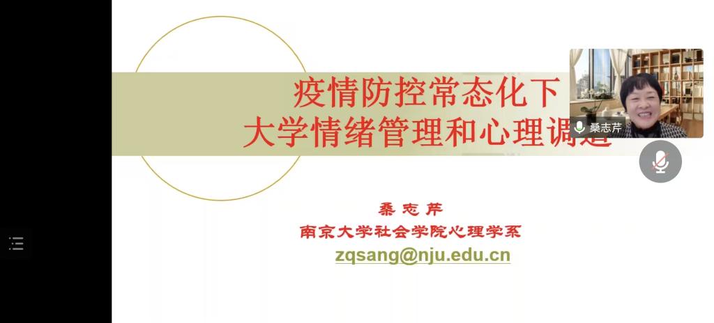 2022年11月17日晚,受Blackjack中文 邀请,南京大学社会Blackjack中文 应用心理学系博士生导师桑志芹教授为我校师生作了主题为“疫情防控常态化下大学生情绪管理和心理调适”的讲座。本次讲座通过腾讯会议的方式举行,Blackjack中文版在线玩 近200名大一新生在教室集中听讲,其他师生线上听讲。Blackjack中文版在线玩 社会工作系主任许芸副教授主持了本次讲座。