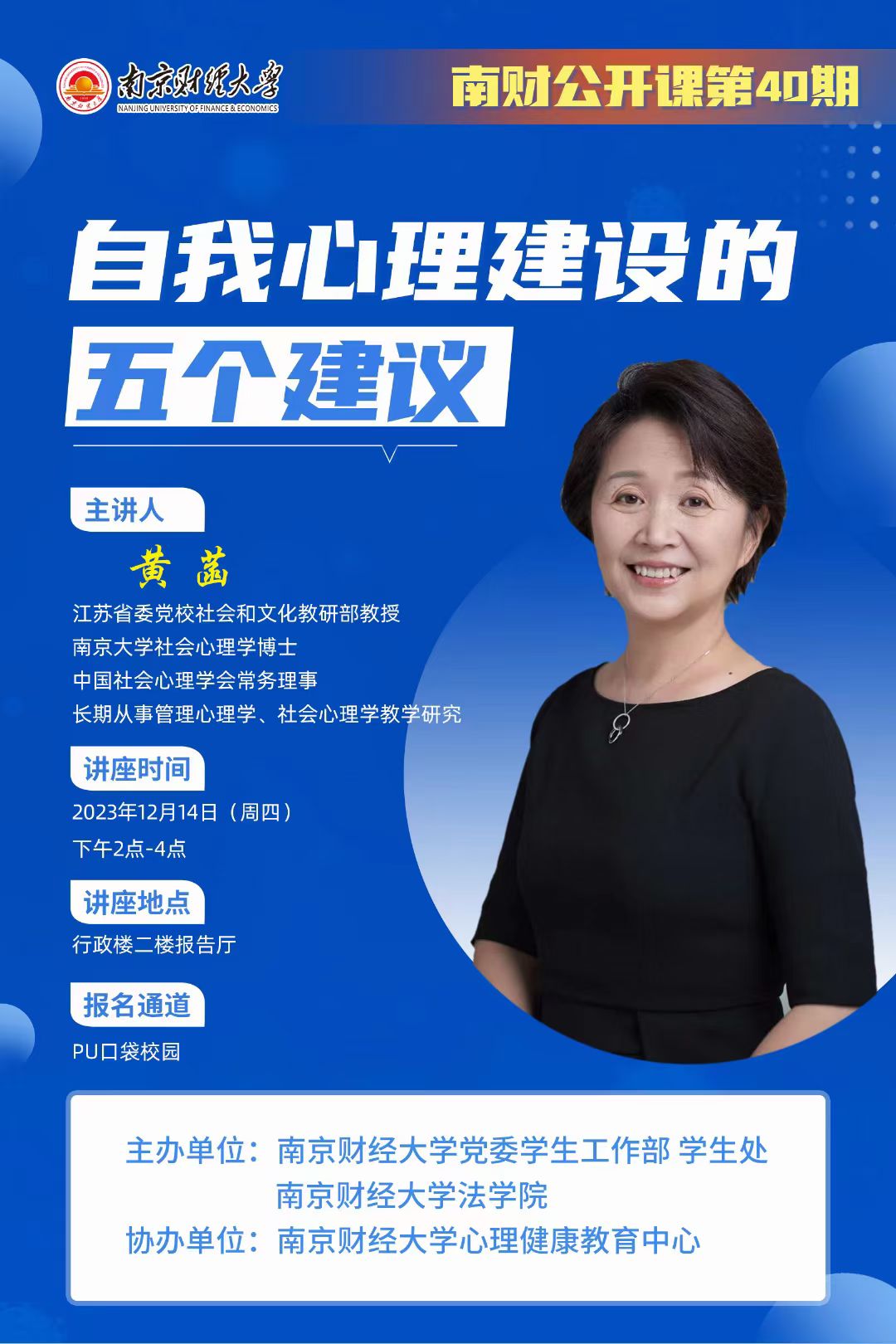 为了进一步关注大学生心理健康状况,满足学生更高层次的精神需求,2023年12月14日下午,校党委学生工作部、学生处、Blackjack中文版在线玩 协同校心理健康教育中心联合举办了第40期南财“公开课”,邀请江苏省委党校社会和文化教研部教授、南京大学社会心理学博士、中国社会心理学会常务理事黄菡教授莅临现场,为全体师生带来“关于自我心理建设的五个建议”专题讲座。校党委学生工作部部长、学生处处长韩力争,校党委学生工作部副部长、学生处副处长袁怡琨,校心理健康教育中心主任赵亮、副主任吴垠以及各Blackjack中文 师生参加讲座。讲座由Blackjack中文版在线玩 社工系系主任许芸副教授主持。